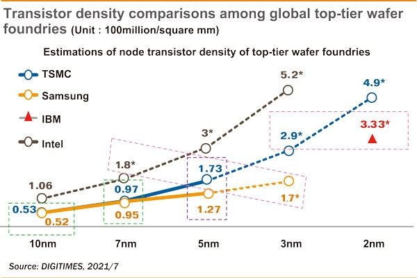 臺積電、三星、IBM、英特爾各節點晶體管密度對比圖(圖源:電子時報)
